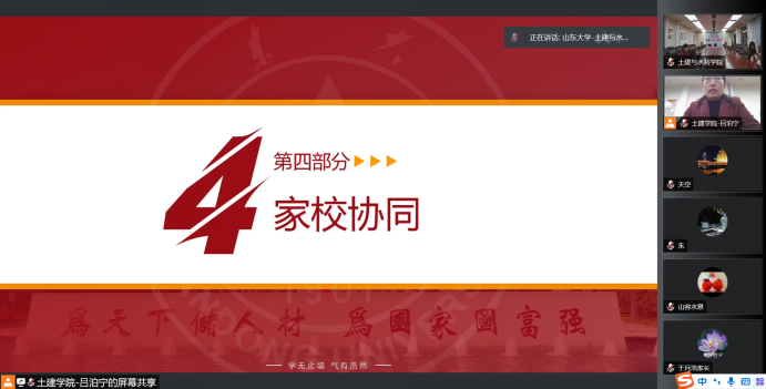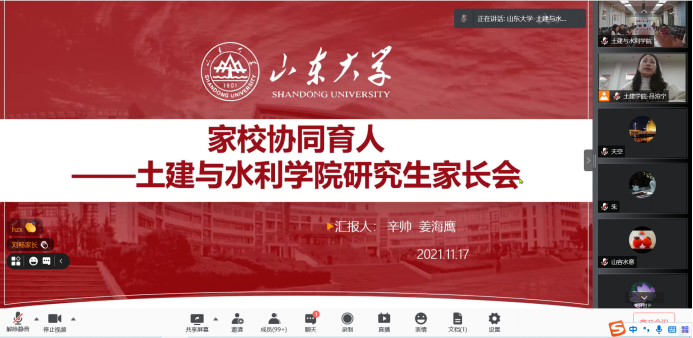 随后,辛帅介绍了现阶段学院的疫情防控办法,现阶段学校采用进出校园备案制,加大疫情防控力度,学生进出校园都需要在系统中登记备案。此外辛书记就学生在校的安全问题作相关介绍,并对家长朋友们对学院工作的支持表示感谢。在会上辛书记多次强调,现阶段研究生面临诸多压力,产生心理问题在所难免,学校跟家庭应该联合起来合理利用学校资源,积极鼓励学生同导师和辅导员沟通交流。辛书记指出,之所以要进行家校协同,就是为了能够更好的让研究生进步,成为社会的有用之才,研究生已经不再是一个孩子,家长和老师都应该尊重他们的独立性和自主性,应该去接纳他们而不是尝试去改变他们,学院希望每一位同学都能够身心健康并取得良好的发展。