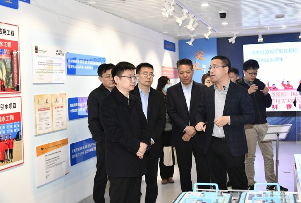 栾宗涛一行调研参观了土木工程学科地下工程灾害防控展厅,听取了隧道超前地质预报自主装备研发情况介绍,观看了岩溶管道高压大流量突涌水封堵材料注浆模拟实验,了解了51视频