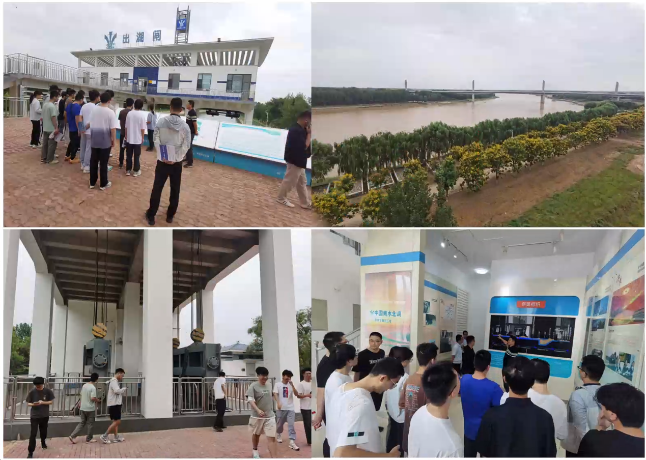 随后,同学们先后前往第七站出湖闸和穿黄工程管理处,通过图文、讲解和现场参观,同学们对南水北调东线穿黄河工程有了更为全面深刻的认识。在黄河岸边的守望展板处,师生们伫立观看学习,被王跃进、王永胜等人在工程建设现场的坚守忠贞精神深深感染。通过现场参观和学习,同学们对南水北调东线输水干渠、东平湖和黄河的关系有了更直接地认识,深刻体会到了调水工程的重要性和运行管理中的复杂性。