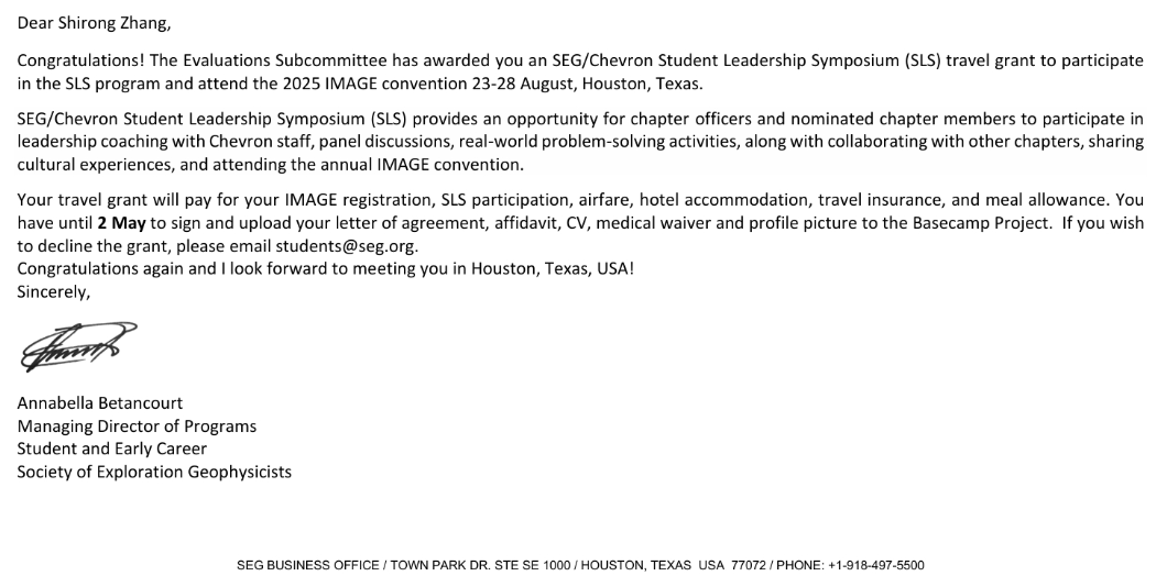 岩土与地下工程研究院地球电磁探测课题组硕士研究生张世榕收到国际勘探地球物理学家学会(Society of Exploration Geophysicists, SEG)的邮件通知,获得SEG提供的资助参加2025年8月23-28日到美国休斯敦举办的SEG/Chevron学生领导力会议(SEG/Chevron Student Leadership Symposium,SLS)和国际应用地球科学与能源会议(2025 International Meeting for Applied Geoscience and Energy,IMAGE 2025)。