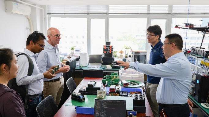 Esben教授参观了地球电磁探测课题组实验室,对课题组近年来在无人机半航空和全航空瞬变电磁系统与软件方面的研究给予高度评价,尤其是针对无人机载电磁系统所开展的轻量化与高集成度设计引起了Esben教授的浓厚兴趣,双方就关心的问题进行了深入交流。