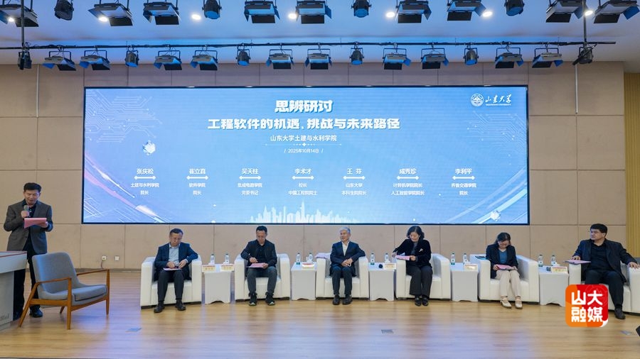 本科生院、集成电路学院、计算机科学与技术学院、人工智能学院、软件学院、齐鲁交通学院有关负责人围绕国家重大需求与专业设置背景、AI崛起对交叉学科学生培养的影响以及工程软件的未来发展路径等主题分别发言,并与同学们展开讨论交流,勉励同学们响应国家需求,面向未来创新,深度结合工程实际,努力探索融合数字孪生、人工智能等技术的交叉学科学习,着力突破国家“卡脖子”难题和行业技术瓶颈,为推动智能建造与智慧工程不断发展和科技强国建设挺膺担当。