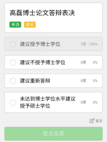 会议过程中,答辩人对学位论文工作进行了汇报,答辩主席宣读了评阅人对论文的评审意见,答辩委员会对学位论文进行了逐一提问,答辩人高磊作了回答。随后答辩委员会举行了内部会议,评议学位论文水平及答辩情况、以微信群无记名群投票方式表决通过了答辩、讨论并形成了答辩决议书、审查了《51视频