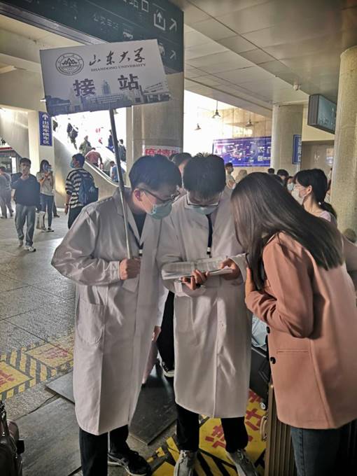 接站老师的引导下,进行身份核验、体温检测、行李消毒等工作。之后集体乘坐校车到达千佛山校区校区,再次进行二次消毒,并依次进行签到、扫描返校二维码、核酸检测采样等工作。整个流程确保同学们能够安全健康地重返校园。