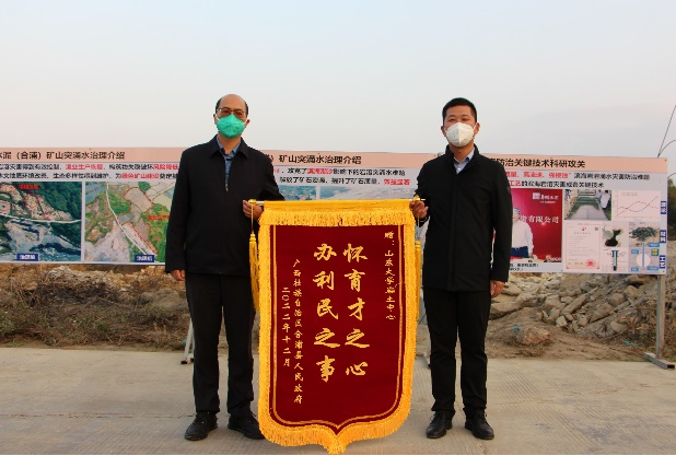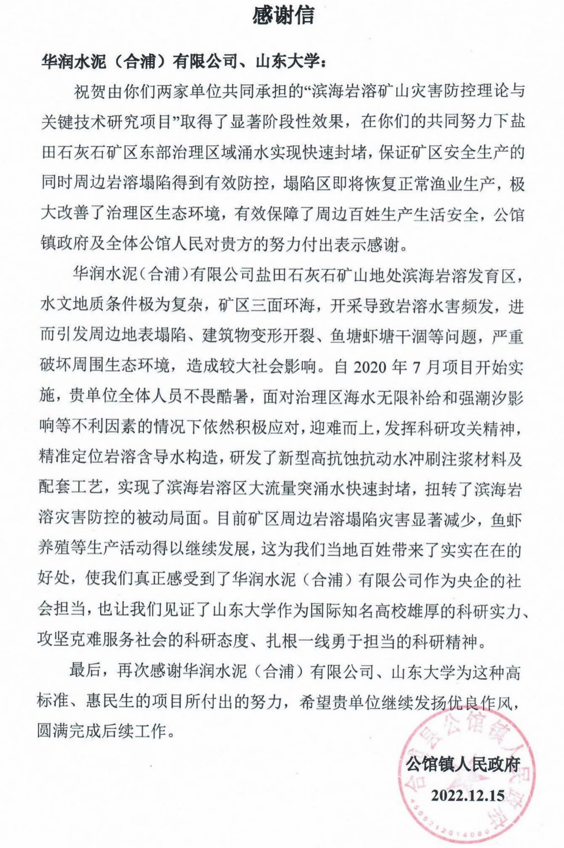 经过一个水文年监测,矿山治理区域无海水渗漏,周边区域岩溶塌陷得到有效控制,受损渔业恢复生产,极大改善了矿区生态环境,为当地带来了显著的经济效益和社会效益。合浦县人民政府对此高度重视,特组织县、镇政府领导现场查验治理情况,对51视频 的精益求精的专业精神、严谨的科研作风、敬业奉献的工作态度予以表彰,对项目取得的阶段性科研效果高度认可,特致函表示感谢并赠予锦旗鼓励。