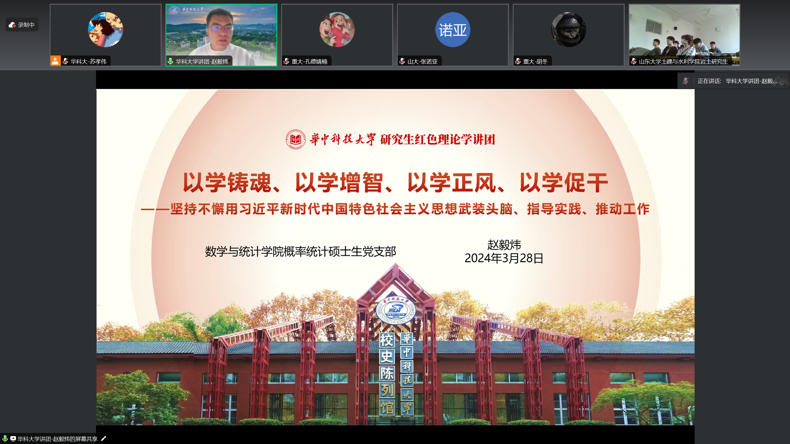 岩土研究生党支部、华中科技大学土木与水利工程学院土木研究生第十一党支部、重庆大学土木工程学院创新团队研究生一、二、三党支部、中南大学土木工程学院隧道第三党支部“线上会议+线下会场”超200名学生党员参加活动。