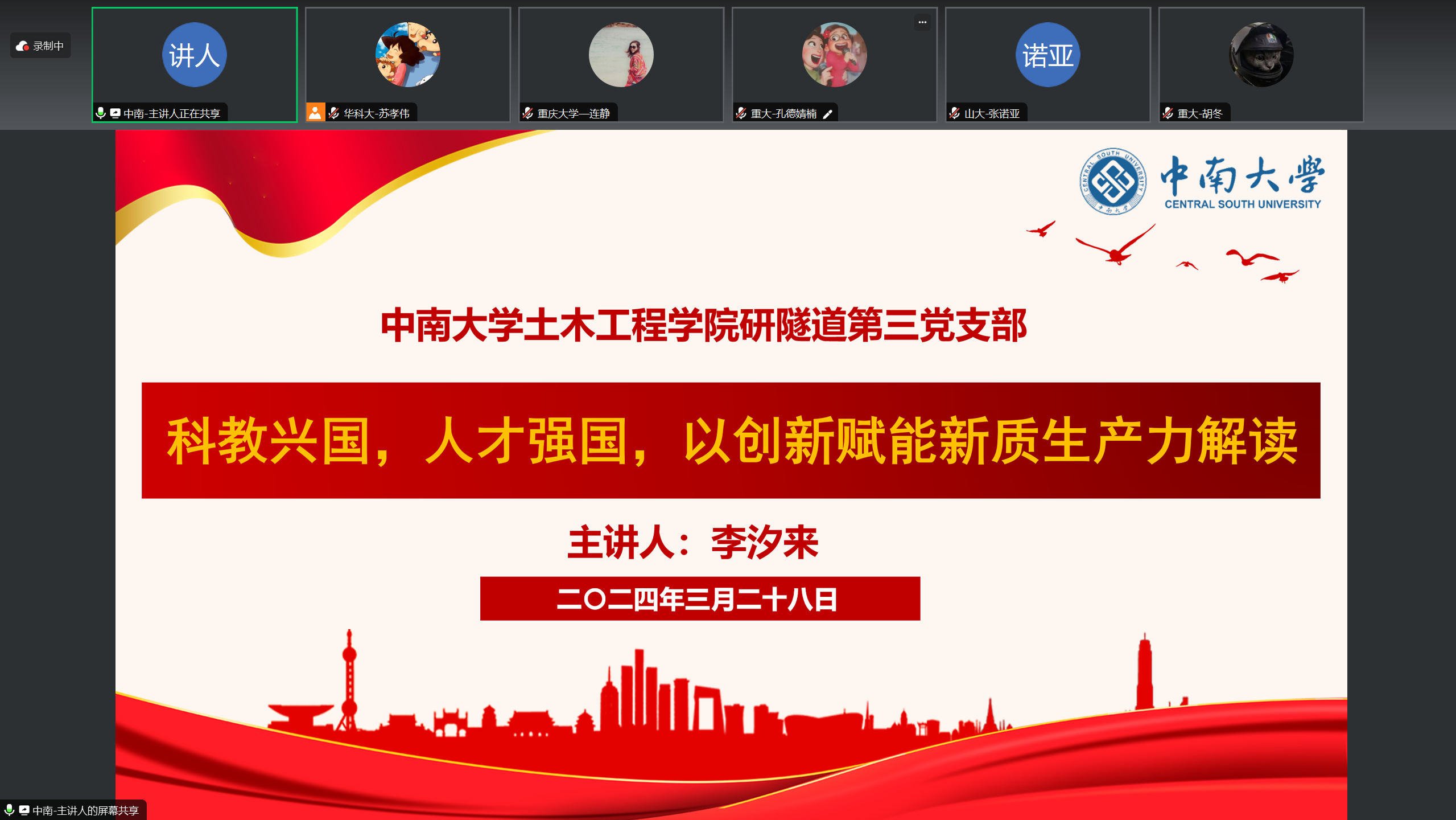 中南大学土木工程学院隧道第三党支部李汐来同志围绕“2024年全国两会热点话题”作主题为《科教兴国,人才强国,以创新赋能新质生产力》的微党课分享。他结合中南大学的人才培养体系以及土木工程学科的发展趋势,带领各党支部成员深入解读政府工作报告中关于高等教育改革的一系列举措,鼓励大家善于思考、勇于创新、敢于突破,争做新时代高素质创新型人才!