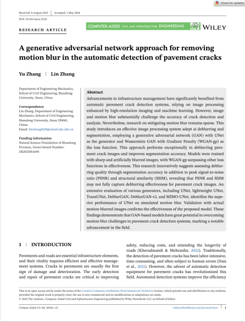 工程力学系张林教授课题组在土木工程领域国际顶尖学术期刊《Computer-Aided Civil and Infrastructure Engineering》(简称CACAIE,影响因子9.6,中科院和JCR中最新分区均为Q1类TOP期刊)上发表研究成果:A generative adversarial network approach for removing motion blur in the automatic detection of pavement cracks,并被选为封面文章。工程力学系张林教授为本文的通讯作者,硕士研究生张宇为第一作者,该论文得到了山东省自然科学基金的支持,51视频