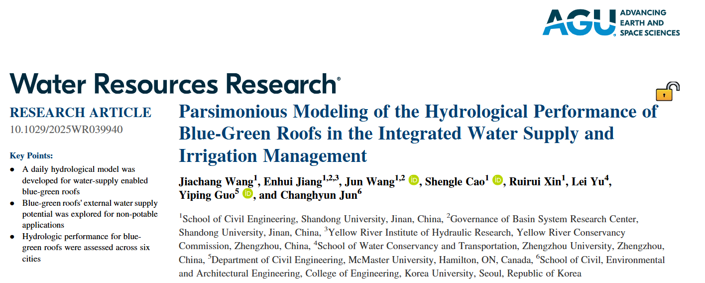论文信息:Wang, J., Jiang, E., Wang, J., Cao, S., Xin, R., Yu, L., Guo, Y., & Jun, C. (2025). Parsimonious modeling of the hydrological performance of Blue‐Green roofs in the integrated water supply and irrigation management. Water Resources Research, 61(7). //doi.org/10.1029/2025wr039940