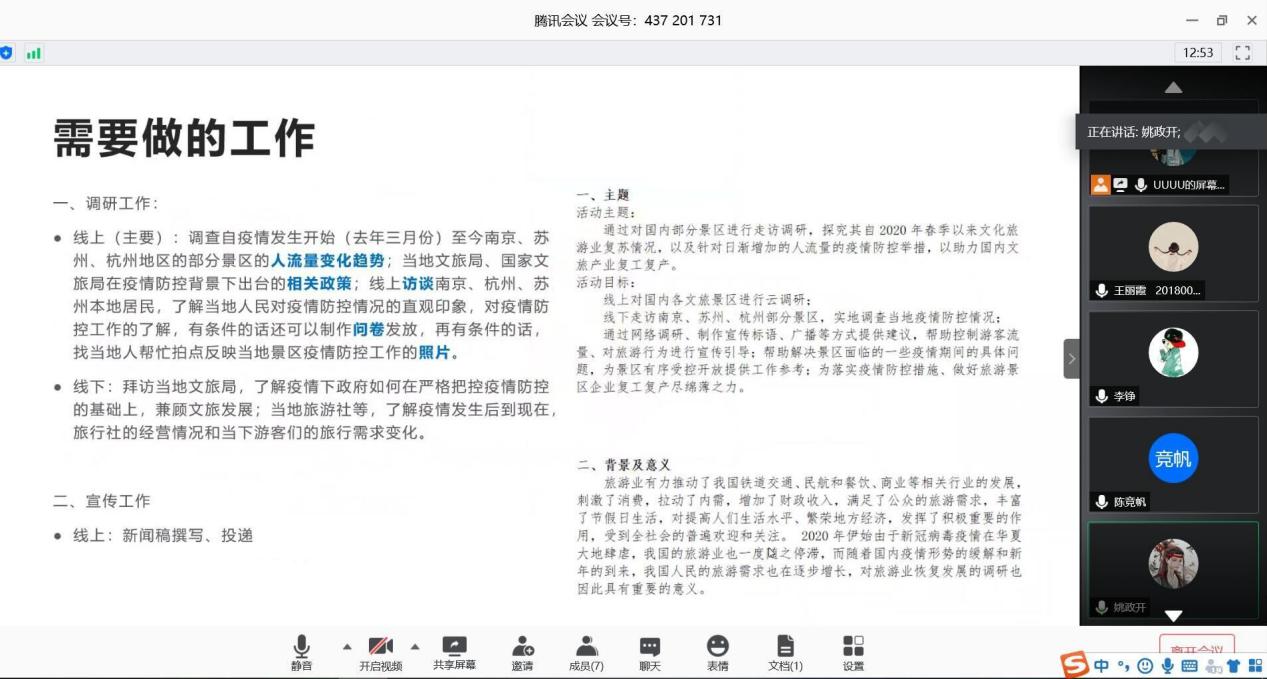 赴苏杭地区关于当地文化旅游业疫情防控情况社会调研活动以线上会议的形式正式召开启动仪式。此次会议由队长陈书婷主持,来自不同学院的6名团队成员参加。