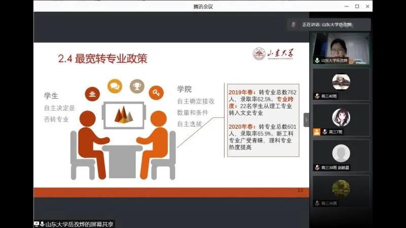 的优势特点、专业设置、招生情况与预想的同学们的疑惑结合起来。同学们提出了“如何看待自己现在的分数和排名,能触摸到山大的排名是多少”、“在高考后进行专业选择时要考虑什么”、“在山大能得到什么层次的栽培和资源”、“在山大,真实的大学生活是怎样的”等问题,岳孜烨结合自己的亲身经历和感受,对这些问题一一作了回答。考虑到相当一部分高中生存在对大学过分的幻想、对专业的不认识,对高校和个人发展的不理解等问题,所以岳孜烨把这几个方面作为宣讲的重点,旨在帮助他们解决实际的困惑和难题。
