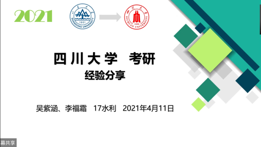 水利系举办了线上考研分享交流会。本次交流会邀请了2017级水利水电班曲勇晓、费琦翔、吴紫涵、李福霜担任分享嘉宾。