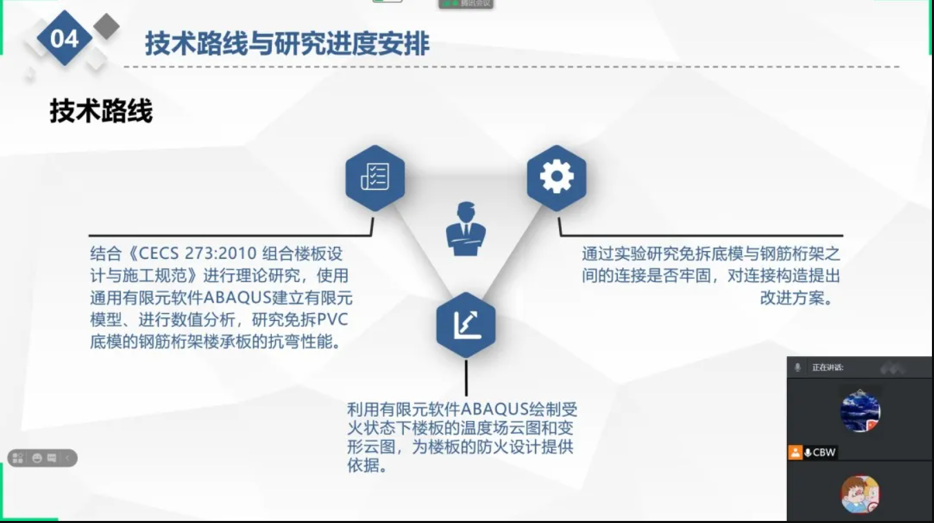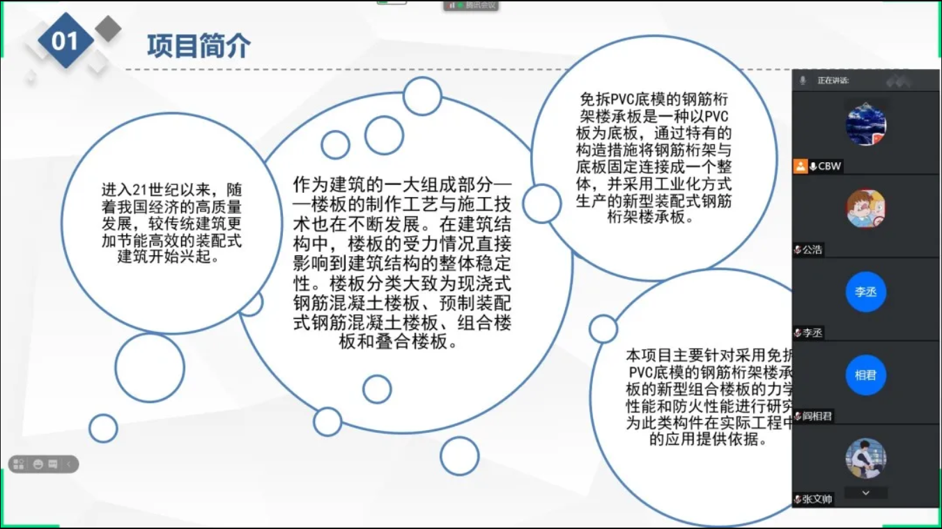 “免拆PVC底模的钢筋桁架楼承板研发与抗弯性能研究”创新创业社会实践团利用腾讯会议进行第一次团队会议暨活动启动仪式。本次会议主要进行项目整体介绍、具体任务进度确认、近期相关工作分配等活动。