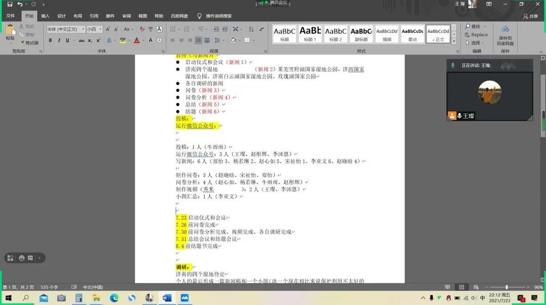 会议中期,团队成员与王璨在线上会议上制定人员分工的安排以及工作内容的详细要求。工作任务分为宣传与内容制作两大板块。在前期宣传中,郑怡、杨若琳等七人负责新闻稿件的撰写与投递;王璨等三人运营“新时代中国特色社会主义生态湿地保护调研团”微信公众号。在内容制作中,赵晓晗等三人的工作任务为以生态价值、环境效益等方面为主题制作问卷;赵心如等四人负责对问卷结果进行分析;王璨、李沛恩负责制作视频成果;李亚文负责分析图汇总。此外每个团队成员在调研完成济南四大湿地的基础上,需要对各自家乡的典型湿地进行调研分析,提出改进意见。最后,王璨将日程安排,内容要点与各队员进行概述总结。