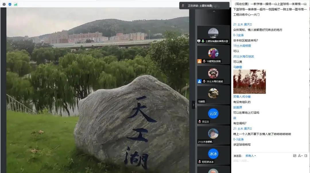 星。在天工湖畔,张瑞康介绍此处常年有水、四季有绿、风景秀丽。沿路到达与同学们学习相关的教学群楼、讲学堂,再至与居住、生活相关的宿舍楼、欣园、悦园、体育馆、风雨操场,张瑞康与新生一一介绍。他在直播中与同学们积极互动,氛围良好。