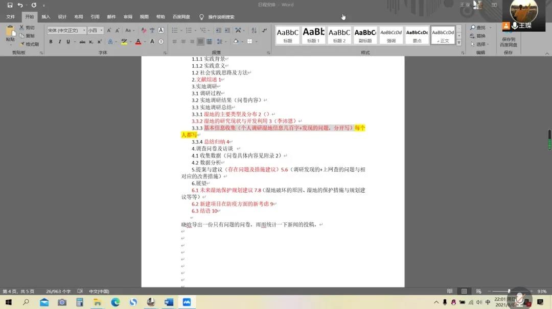 首先队长王璨总结梳理了本次社会实践的所有工作。本次社会实践通过前期实地调研,后因为疫情全部转线上调研,针对济南以及各成员家乡的湿地现状、问题、以及目前比较好的保护方式等展开调研;问卷调查围绕生态湿地的生态价值、环境效益、设计手法、保护政策和改进建议五个方面进行;最后队员们通过资料查找充分了解了我国湿地保护的现状并学习了与湿地相关的景观设计手法,针对前期的总结、分析发现家乡湿地问题,设计解决办法。随后针对结题报告,大家一起讨论结题报告内容,以及目前还欠缺的关于未来保护规划的内容,王璨针对后续收尾工作进行分工,每人针对个人调研湿地进行总结并提出改进意见,归纳实地调研结果、问卷调查结果,讨论得出湿地的主要类型及分布、有关湿地的研究现状与开发利用,针对目前湿地进行提案与建议。团队积极展望未来,根据所学知识针对未来湿地提出保护规划建议。