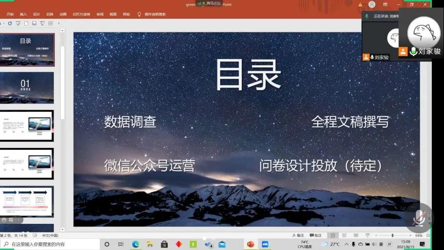 同时,会议还明确了“绿色起源”调查团中的小组分工,数据调查工作主要由马辉负责,微信公众号的运营主要由刘家骏负责,而新闻资料的撰写与投稿主要由杨逸帆负责。