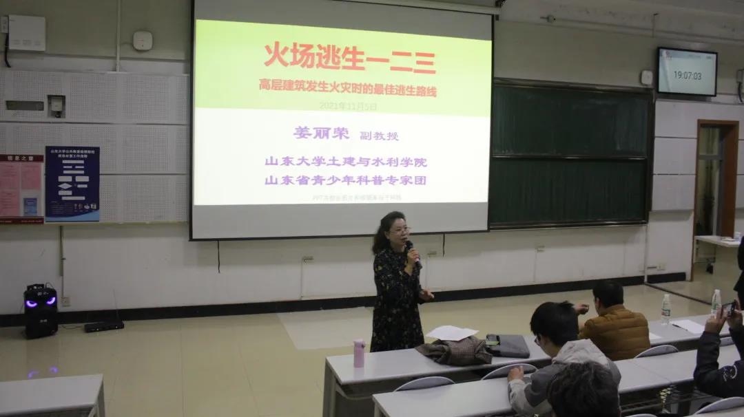 会议伊始,姜丽荣带领同学们从土木工程的角度认识防火措施与火场逃生,由此引入本次讲座主题“超高层建筑着火时如何逃生“。姜丽荣提出,当火灾发生时,超高层建筑住户应选择向下跑。接着,姜丽荣以生活中常见的楼梯类型为例,举出能够火场中能够选择的逃生通道,应选择矩形踏步的楼梯进行逃生。姜丽荣以专业角度讲解超高层建筑的逃生路线,提出选择避难层躲避是降低伤亡率的有效措施。