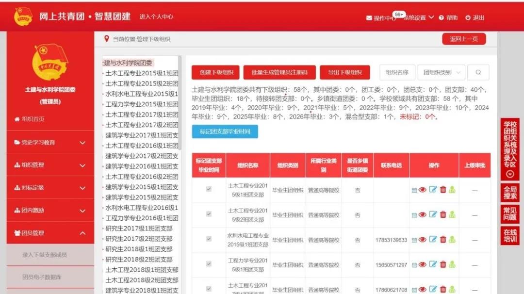 组织部负责管理学院的智慧团建系统。10月底完成了所有新生的转入操作,11月根据校团委“学社衔接”相关文件陆续展开毕业生转出,目前已完成所有毕业生转出工作。12月完成学院团支部定级自评复核工作,期间协助各团支部解答智慧团建操作及系统问题。
