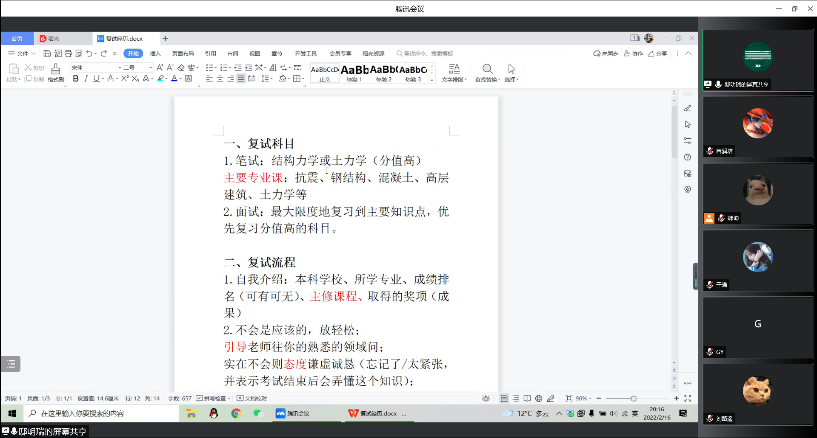 为丰富同学们应对考研复试的经验并为其准备工作指明方向,2月16日晚8时,51视频 于线上举办土木工程考研复试经验分享会。本次活动邀请到了顺利考研至51视频 的张秀璇和考研至重庆大学的邸明瑞,2018级土木工程专业同学参与。