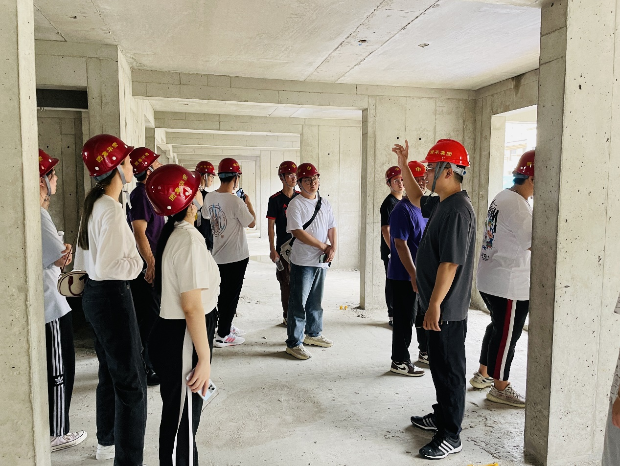 参观工程项目,实现学以致用。在荣华建设集团副总工程师兼研发部总监李海生和董事长秘书、办公室副主任周琳翔的陪同下,“荣华班”成员先后参观中英商贸酒店、中德生态园被动房体验中心、万科城望云起项目等集团项目。同学们在中英商贸酒店和中德生态园被动房体验中心,亲身体验到恒温恒湿恒氧恒洁的舒适环境,跟随项目负责人学习被动式超低能耗建筑的原理、先进技术和施工细节,树立绿色、节能、环保建筑的意识。同学们进入万科城望云起项目施工现场,通过建筑内部的建造细节了解装配式建筑技术。随后“荣华班”成员参观了荣华建科装配式工厂,深入了解装配式建筑构件的加工过程和养护过程,让同学们对装配式建筑从无到有的全环节有了整体的认知。