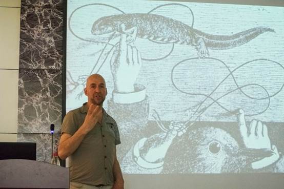 讲座开始,库克教授以超现实主义画派的起源与发展为主要线索,将东方禅文化与之串联在一起,阐述自己对于艺术创作和建筑设计的独特观点。首先他通过一幅经典画作向在座的老师和同学们展示超现实主义画派的绘画特点,从而引出法国作家Andre Breton及其代表的超现实主义画派的艺术理念。随后,他就法国作家Andre Breton的绘画作品、创作思想进行深入阐述,剖析超现实主义的含义——超自然的、无意识、无理性的精神自由。他认为弗洛依德所创立的精神分析学说,对超现实主义艺术的发展具有重要意义。结合利用不同绘画技巧创作出来的超现实主义的、或怪诞或离奇的艺术作品,库克教授带领到场师生体验了一场超现实主义的饕餮盛宴。他认为即使东西方在绘画创作手法上面有所不同,但是画家们所追求的那种内在的、随心所欲地释放自己的能量、展现自己创作灵感的精神追求是相通的。最后,库克教授分享了自己的绘画经历和创作作品,并以此表达了自己的观点即无论我们从事何种工作,都应该回归孩童时代追随自己的内心,自由地去创造、大胆去创新。