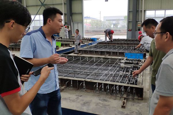 上午九点左右,实践团队在中铁建工滁州项目部总工程师杨总工的带领下,到达了滁州市现代建筑科技股份有限公司装配式构件工厂进行考察参观。装配式工厂的李厂长热情地接待了团队成员们。李厂长介绍说,滁州现代科技公司是一家负责装配式构件深化设计、生产、运输、安装等一系列PC相关业务的技术导向型公司。公司占地256亩,室内车间面积2万平方米,室外生产2万平方米,投资规模4.78亿元,产品覆盖滁州8个县市区、南京、镇江、扬州、苏州等地区。接下来,李厂长为队员们介绍了装配式建筑的优势以及时下装配式建筑良好的发展趋势。最后,团队成员重点向厂长提出了几个问题。一是装配式建筑当前为何材料成本偏高,二是为何无法大面积推广,三是在PC构件制作过程中有哪些难题。李厂长说,成本偏高的原因是多方面的,最主要的还是技术不成熟、以及人才的缺乏;再加上大家对于现浇混凝土的观念根深蒂固,改变要有一个循序渐进的过程,因此在中国目前必须靠政府政策扶持,才能使PC建筑模式早日市场化。在PC构件制作过程中,由于技术不成熟,导致层层分包,初步设计、深化设计、构件制作都分由不同单位执行,统一度差,就导致了构件预埋点位时常会和设计相矛盾,在现场拼装出差错,导致构件强度下降。