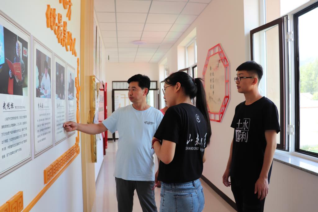随后,村党支部成员郭诚带领成员们前往党群服务中心,对综合服务处和少数民族之家的特色内容进行了介绍。在此处,同学们了解了小庙子村的民族服饰配饰、民俗工艺和饮食文化,感受到浓厚的民族气息,也认识到了民族团结在发展中的重要地位。沿着摄影展示连廊前进,同学们体会到小庙子村的巨大变化,在村党支部书记赵会杰的带领下,村“两委”班子成员积极工作,全村百姓齐心协力,全力推进乡村振兴发展。在会议室里,郭诚向同学们详细介绍了小庙子村在民族团结、生态治理和融合党建工作方面的举措,展现出村党支部“党建引领 发展共赢”的结构特色。最后,郭诚以小庙子村的教育情况为切入点,鼓励在场学生把握教育机会,打好专业基础,为乡村振兴发展引进优秀资源,输入新鲜血液。
