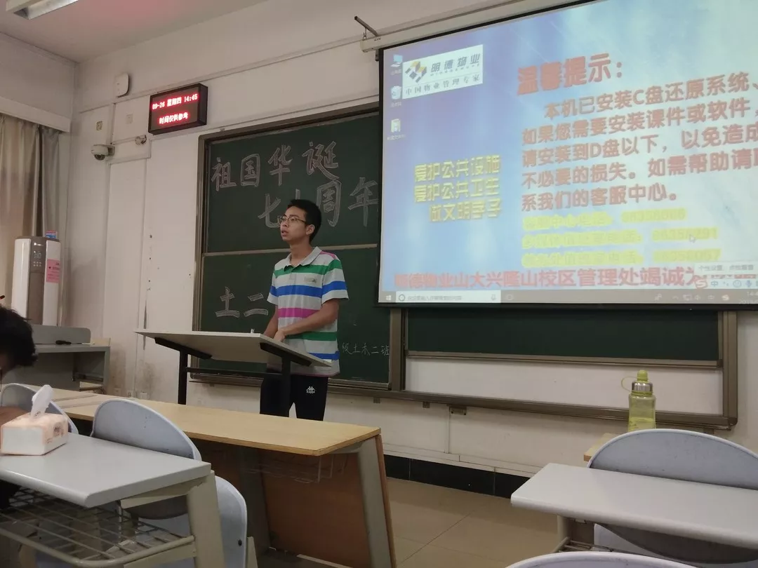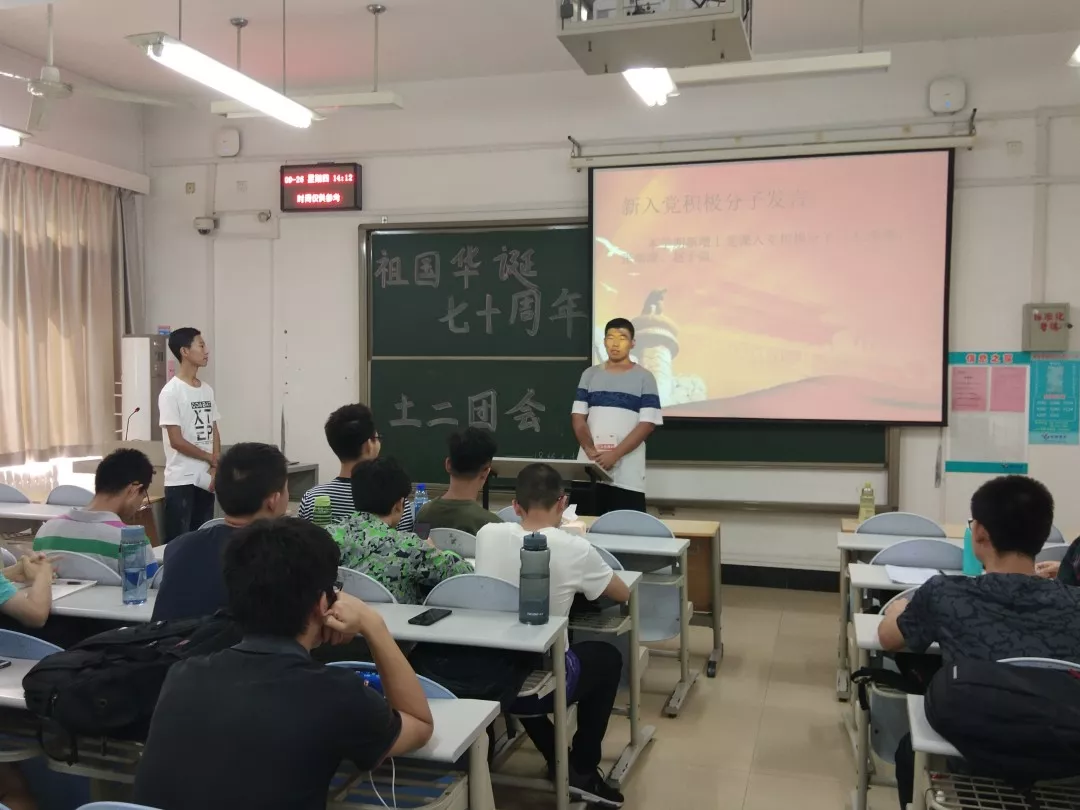 下午2点,会议正式开始,全体同学起立奏唱国歌。随后三名新入党积极分子发言,讲述了自己对新中国成立70周年以及党的认识,表明自己会以党员标准严格要求自己,为同学服务,并以 “此生无悔入华夏,来世还在种花家”表明自己身为中国人的骄傲与自豪。随后全体同学观看有关新中国发展历程的系列短视频。“铭记历史,不忘初心”展示了清朝末年至新中国成立期间,前赴后继奉献自我的代代中国人;“祖国山河,见证腾飞”视频中,山川河流、乡村城市见证了新中国成立70周年来的巨大飞跃,见证了中国发展腾飞的历程;“中国梦——你我的梦”见证着千万人为实现中国梦坚持不懈的奋斗;“祖国未来,青年使命”表明了青年一代对祖国未来的重要性:青年兴则国家兴,青年强则国家强,青年一代有理想、有本领、有担当,国家就有前途,民族就有希望。最后,程小洪对此次团会进行总结,表示希望“江山千里娟秀,欢颂祖国万年常青,神州大地繁花似锦,祖国长空乐曲如潮”。