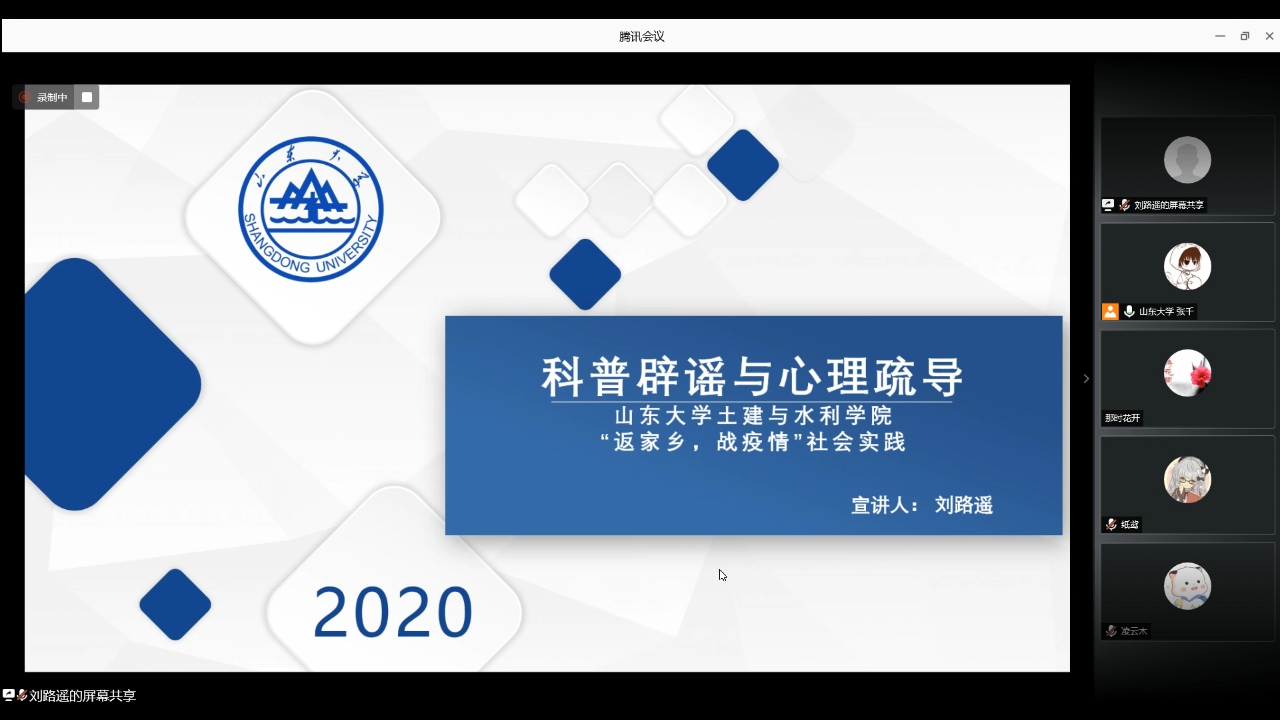 “返家乡,战疫情”社会实践第一期宣讲会于线上召开。参会人员为内蒙古乌海市乌达区兴华社区、山东省泰安市肥城市新城街道办事处贵和社区、湖北省枣阳市西城开发区靳庄社区居民。本次会议由团队成员刘路遥担任主讲,实践团队队长张千主持。