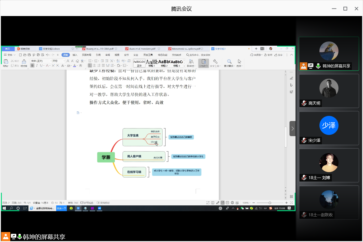 关于对家乡所在地企业复工复产和大学生就业形势及行业政策调研下“学兼”APP软件设计创新队召开前期调研线上讨论会议,就前期实地调研结果进行分析讨论。本次会议由队长韩坤主持,全体团队成员参与。