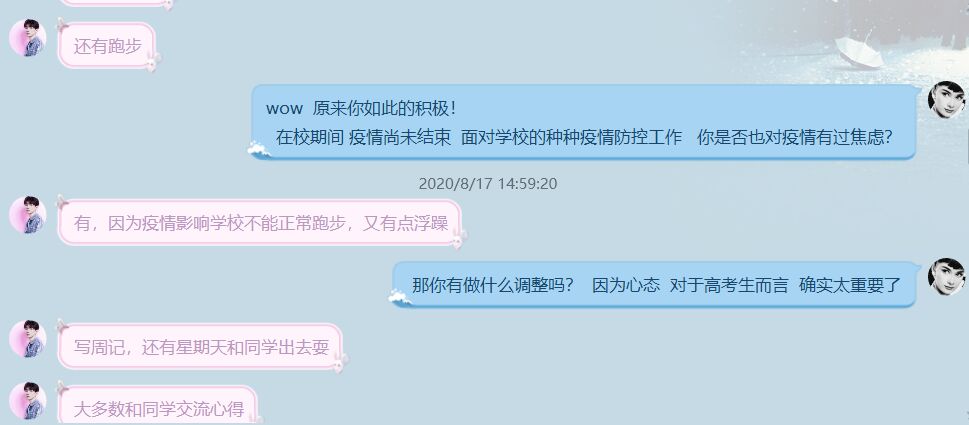 第一位受访者是女生,在调研员问及是否对于疫情有过焦虑的问题时,她表示,由于疫情影响不能正常地进行体育锻炼,导致个别同学产生心理上的压力。有的同学因为长期处于室内学习,出现了情绪失控、易怒等情况。第二位受访者是一位男生,同第一位女生受访者相反,他则是更喜欢在家学习的感觉。他认为在家学习虽然上课有些不便,但是有了更多的自主学习时间,在做练习时能有较时间去思考。