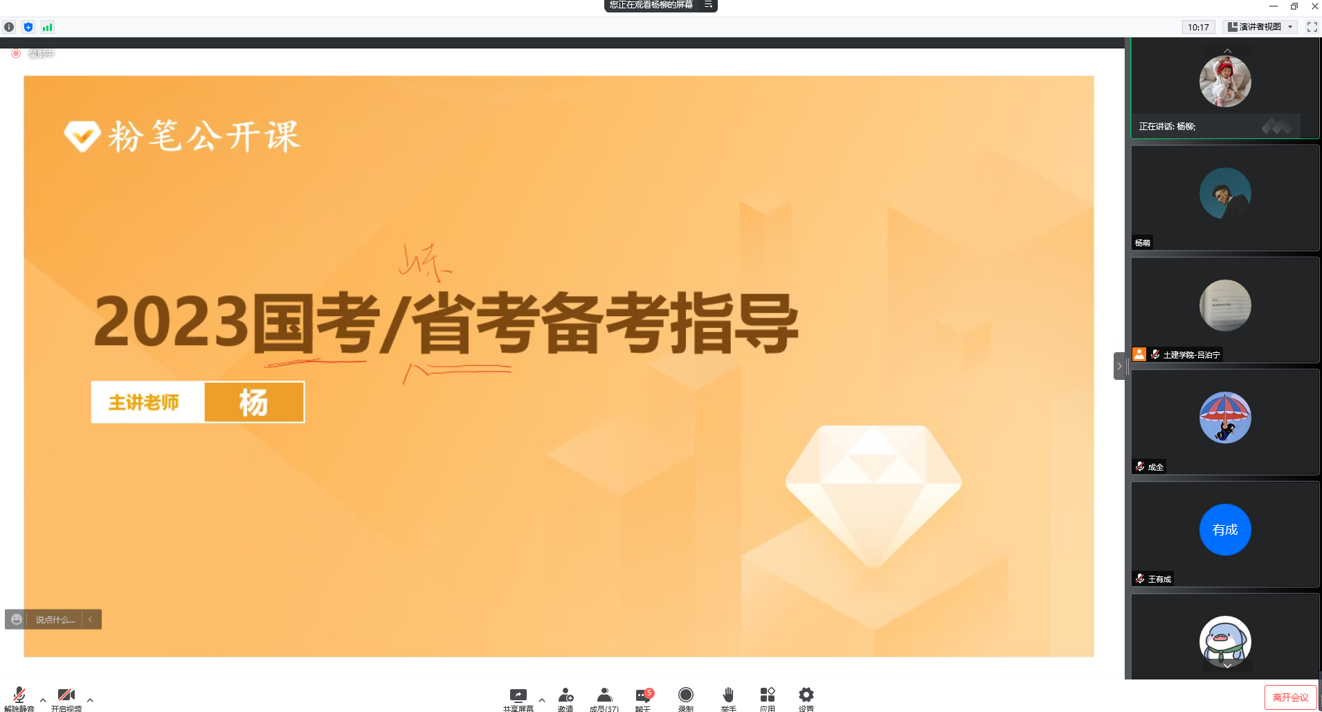 以线上腾讯会议的方式,开展了2023年公考规划备考讲座,粉笔公开课的杨柳受邀为同学们分享培训备考的相关经验和技巧。学院部分研究生参加本次讲座。