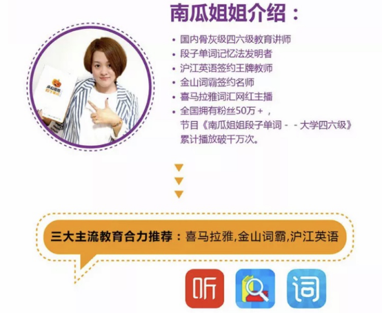 4、对于参加本次活动前100名学员,免费获得南瓜姐姐段子单词一本,对于活动现场互动学员将获得南瓜姐姐亲笔签名的段子单词一本。