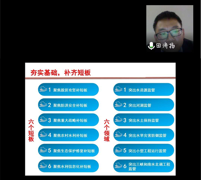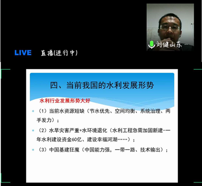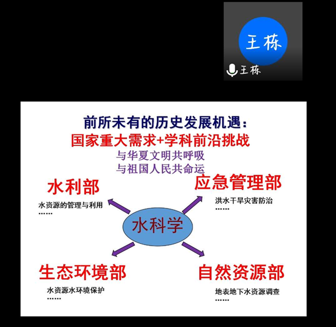 青年学子的云端恳谈。他首先分析了中国的水资源现状:我国水资源四大问题为水多、水少、水脏、水浑,主要表现在洪涝灾害、水资源短缺、泥沙问题、生态环境需水量逐步提高四个方面;中央一号文件聚焦水利、“海绵城市”建设推进、河湖长制贯彻落实、五大战略与“两山论”指导工作方向,在当今中国发展进程中水利事业具有重要地位。他带领同学们走进水世界,在广义和狭义上认识何为水资源,深度了解水循环,辨析水文学概念及其分类,学习了解水文的不确定性。在他看来如今水利专业青年学子正面临前所未有的历史发展机遇——国家重大需求与学科前沿挑战,水科学可衍生出水利部、应急管理部、生态环境部、自然资源部,水利专业青年学子生逢其时、大有可为。