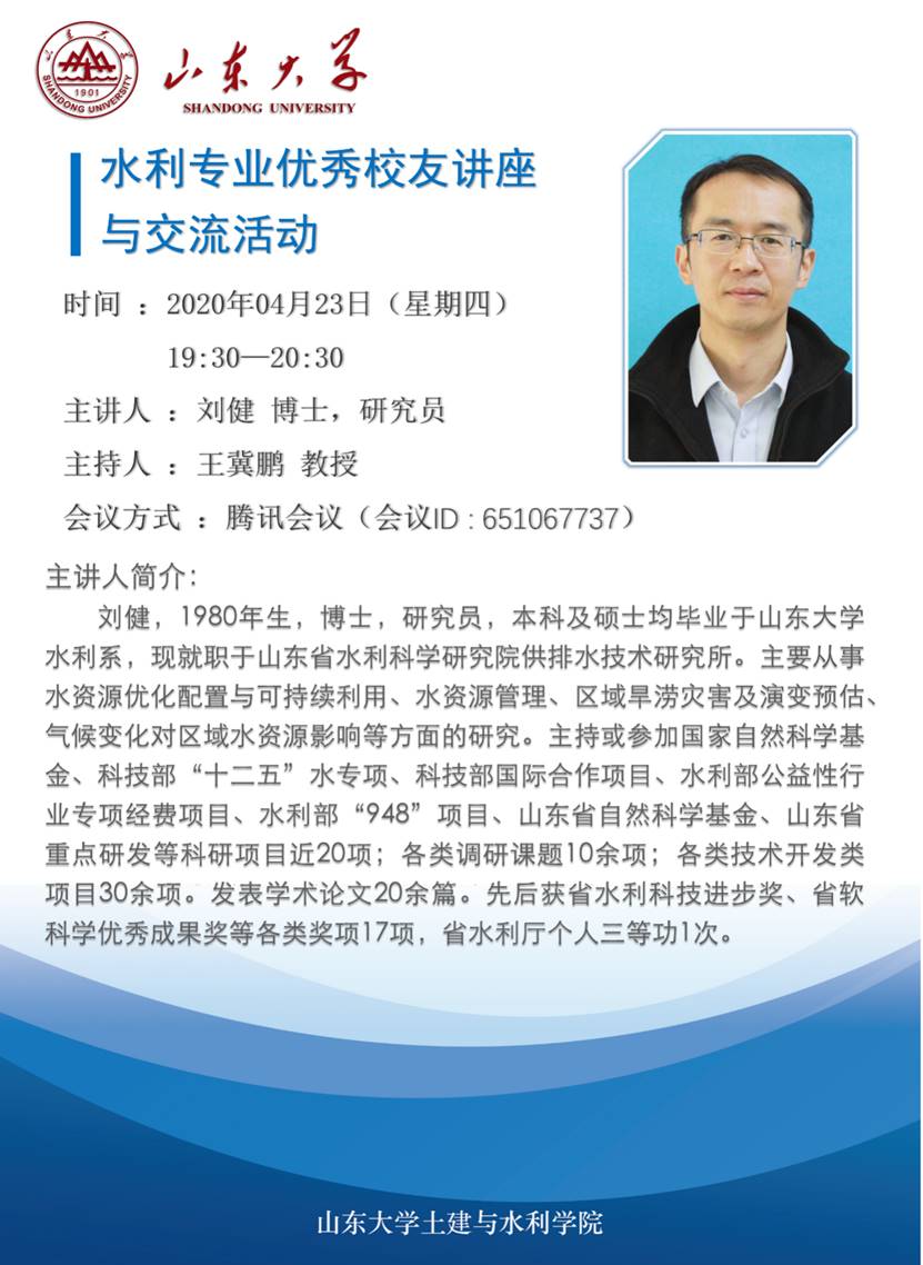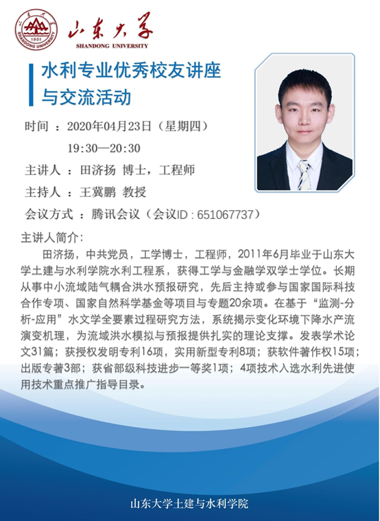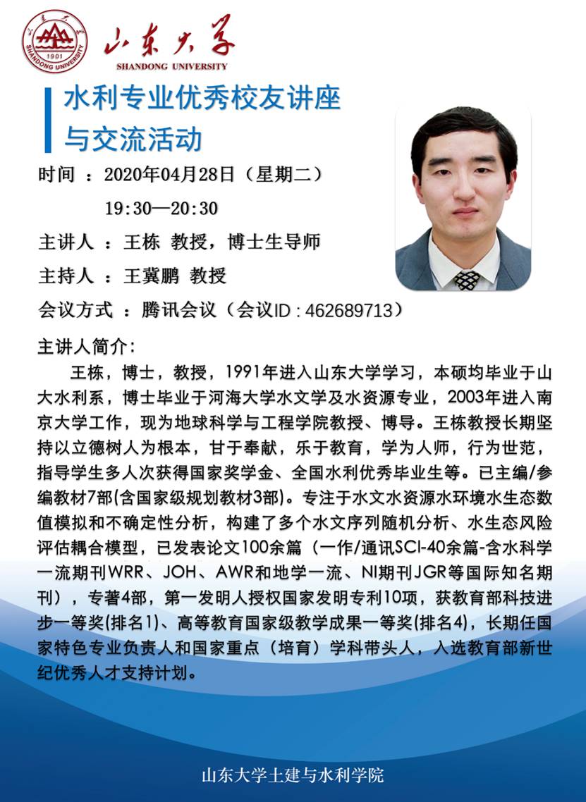 水利系举行水利专业优秀校友线上讲座与交流系列活动。水利系优秀毕业生代表,南京大学教授王栋博士、山东省水科院研究员刘健博士、中国水科院工程师田济扬博士受邀进行了线上讲座与经验交流,会议由王冀鹏教授主持,水利系党支部书记苗兴皓出席会议,水利专业全体一年级本科生和部分其他年级同学参加了此次会议。