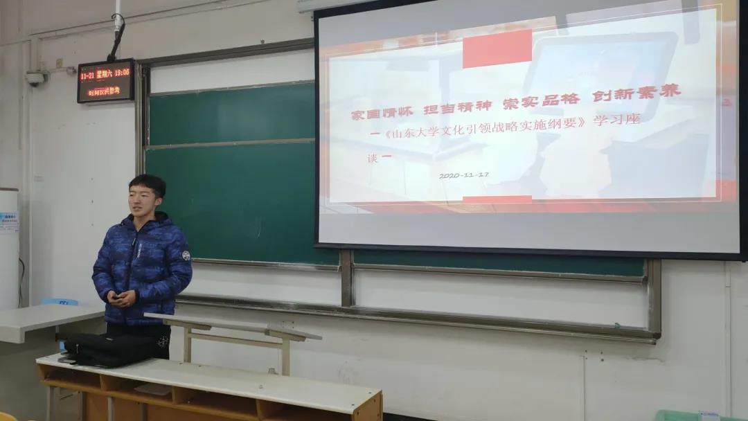 文化引领战略实施纲要》。他将党代会的主题以及党代会以来的成就等并与山大现状相结合,指出应高举习近平新时代中国特色社会主义思想伟大旗帜,全面贯彻党的十九大精神,创新发展理念,激发办学活力,推动内涵发展,追求卓越,只争朝夕,奋力开创中国特色世界一流大学建设新局面,为实现中华民族伟大复兴的中国梦作出山大贡献。第三部分,刘鹏用各种大型会议科普和公报内容学习两个主题带领同学们学习了党的十九届五中全会精神。他讲解了全国人民代表大会、全国人大常务委员会和全国人民政治协商会议三种会议。然后他开始了详细讲解了党的十九届五中全会精神,全会听取和讨论了习近平总书记受中央政治局委托做的工作报告,审议通过了《中共中央关于制定国民经济和社会发展第十四个五年规划和二零三五年远景目标的建议》,习近平总书记就《建议(讨论稿)》向全会做了说明。