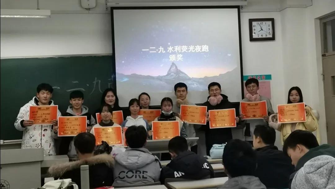 晚上七点半,全体成员于风雨操场集合完毕,活动正式开始。此次荧光夜跑接力跑活动采用6*200m接力的形式,每个班级男女同学各三名参与比赛。比赛队员熟悉比赛规则后分别到各自的起跑线就位,等待比赛开始。随着一声“跑”,参赛队员如离弦之箭一般冲出,挥动的荧光棒如黑夜里的点点星火。经过一番激烈角逐,2019级水利班获第一名,2018级水利班紧随其后,获第二名。活动结束后全员于兴隆山教学楼群2201进行颁奖仪式。