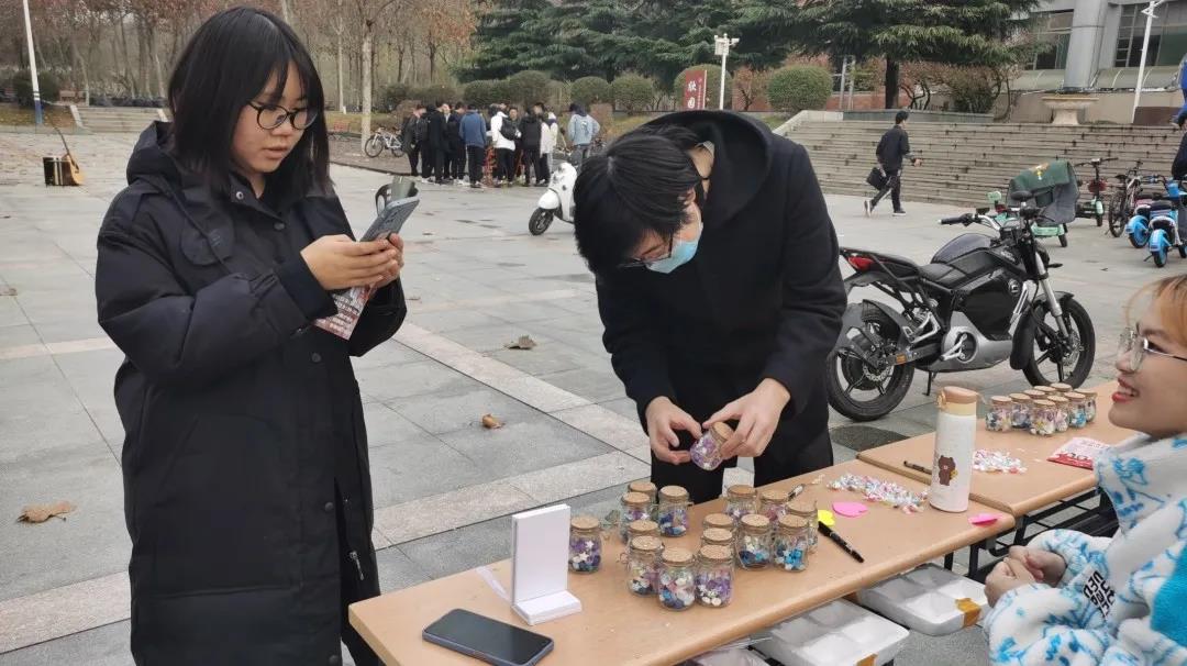 2020级建筑二班于11月21日中午在欣园西门举办义卖活动。本次义卖活动的卖品主要是许愿瓶,其中装满了同学们亲手折叠的纸星星和买来的糖果。同学们别出心裁,将对他人的美好祝愿写进纸星星中,将此心意传递社会,传递远方。