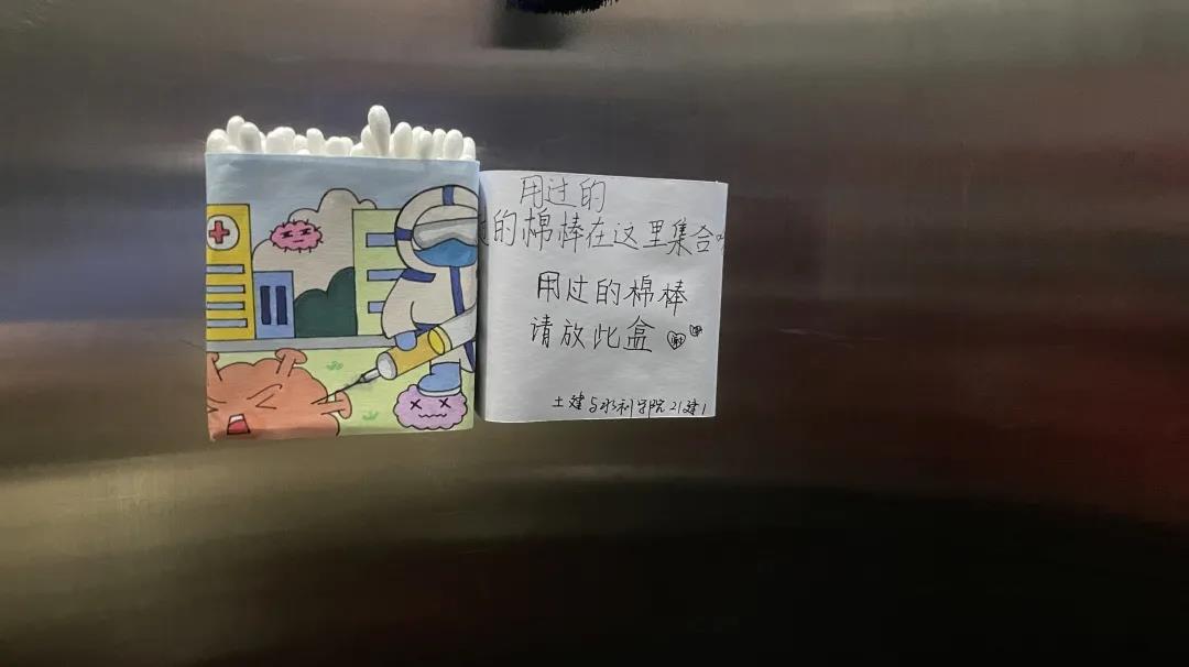 在与物业管理人员联系沟通后,同学们将前期准备好的棉签盒安放在兴隆山教学楼的三个电梯内。同学们首先考察了电梯的内部空间,选择合适位置放置棉签盒,并放入了棉签。棉签盒的安装选取了合适的高度以及美观的间隔空间,使安装方式实现了适用性和艺术性的统一。