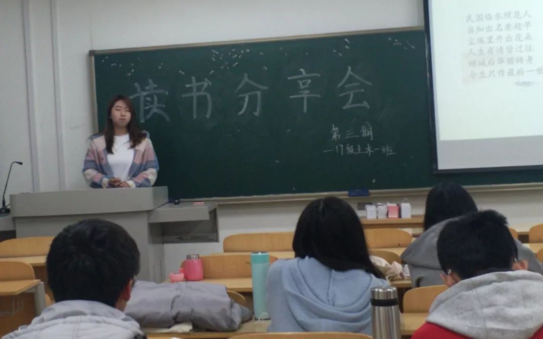 17土木一班第三期读书分享会作分享的七名同学都用精美的PPT详细介绍了书籍内容,同时充分抒发了个人的读书心得,在场同学认真聆听,偶尔也会产生共鸣。此次活动的开展有利于班级形成浓厚的思想交流氛围,与此同时,活动开展前两天,正是第24个世界读书日,这为鼓励大家多去阅读提供了良好的契机。