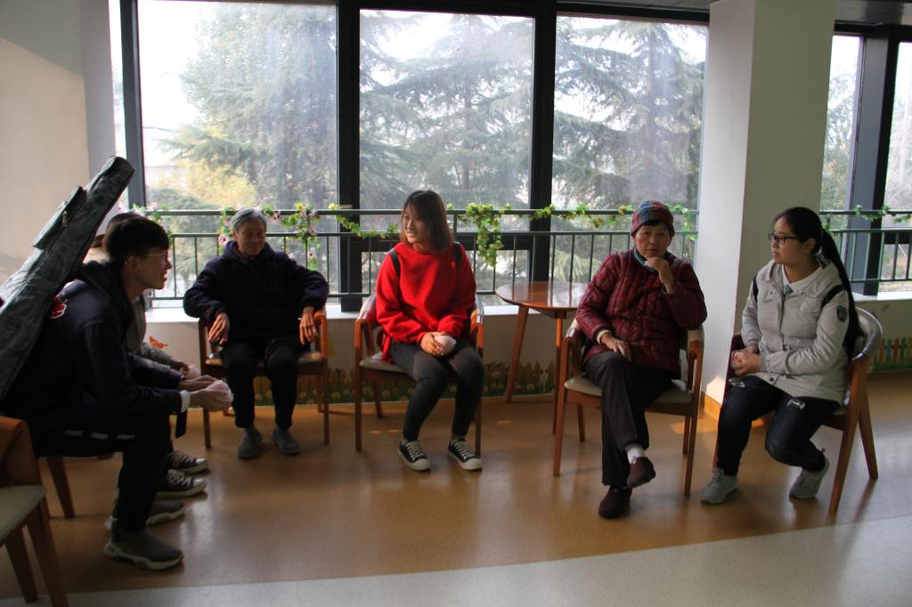 随后,同学们按照分工开展相应的志愿活动,为每个房间的老人送出新鲜水果和亲手制作的纸花球、小天鹅,并与老人聊天、了解他们的生活,与老人一起唱红歌……一个个暖心的活动,既传达了同学们的志愿热情,又传递了同学们对老人的关心与祝福。随后,大家现场表演了精心排练的节目,吉他、新疆舞、合唱等节目都获得了阵阵掌声。在场的老人观看同学们的表演,与同学们聊天,度过了一段美好的时光。