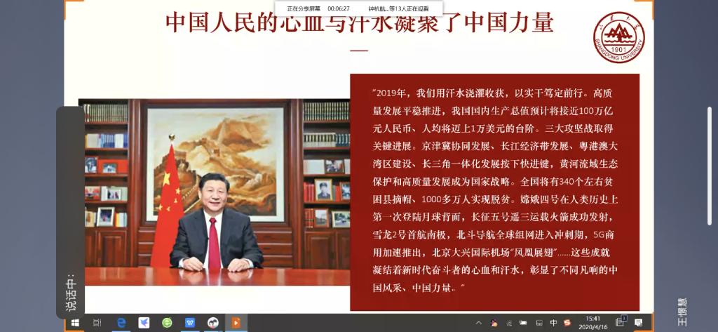 王憬慧首先用习近平总书记在二〇二〇新年贺词中提到的话作为开头,指出新时代中国取得的诸多成就离不开各行各业人民的辛勤劳动,随后,王憬慧列举外卖小哥、公交司机、扶贫干部、城市建设者这四种劳动者的风采,诠释在平凡中也可以孕育伟大,同时也展示了几组来自地铁铁轨维修工、点钞员、环卫工及医生的手部照片,让同学们直观感受到了各行各业劳动者的艰辛。在展示最后,王憬慧以疫情下的青年志愿者们为例,鼓励同学树立劳动意识,砥砺奋斗,同时围绕着“致敬”这一主题,全班同学一起“云”观看了一集《大国工匠》纪录片,对纪录片中从事危险行业却毫不畏惧勇担重任的工程师们,同学们的崇敬之情油然而生。