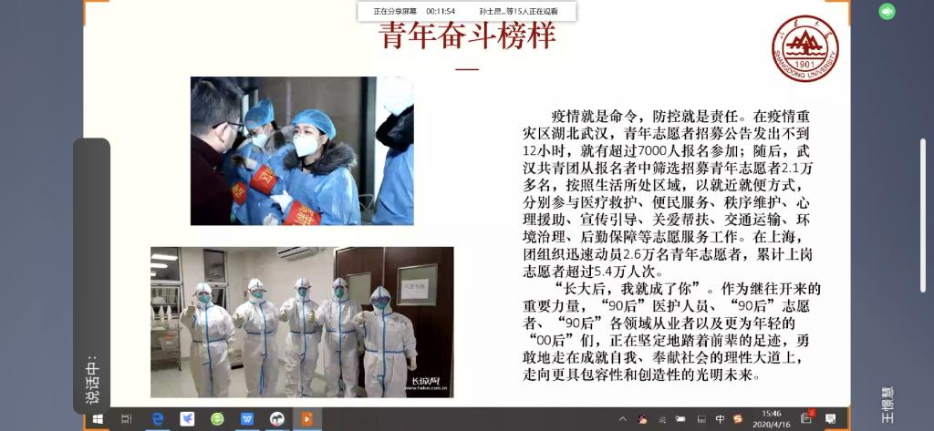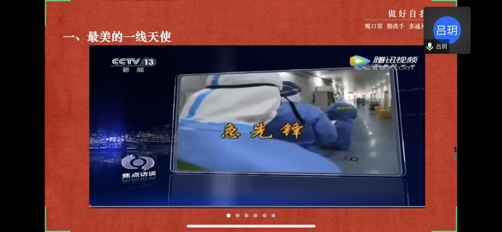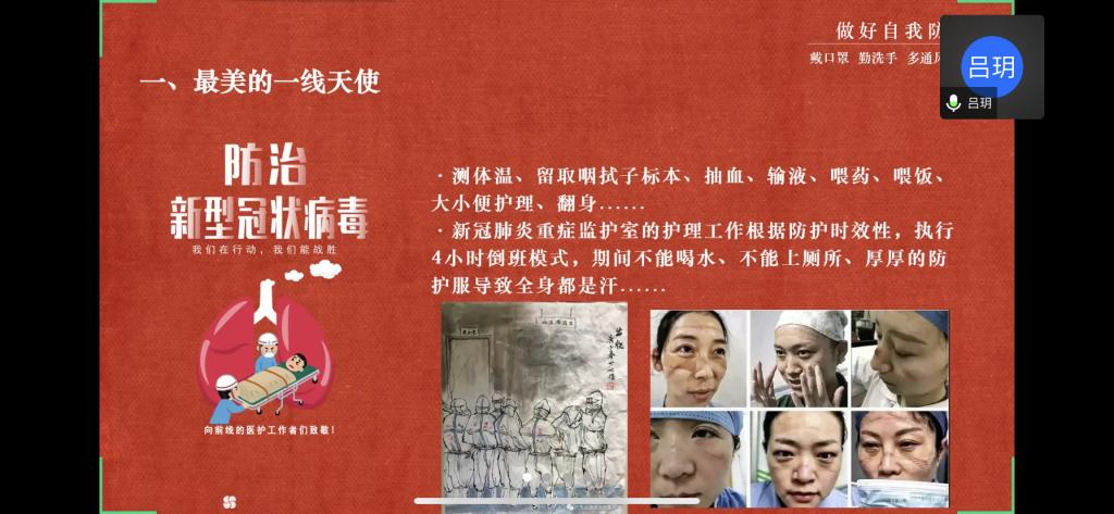 在第二环节,围绕此次疫情,吕玥为大家分别介绍了疫情期间医务人员和社区劳动者的工作内容,并通过图片让大家进一步体会劳动者们的辛勤奉献,随后又向大家推荐观看了两段赞颂疫情劳动者的视频节目。视频结束后,王憬慧对本次主题团日活动进行总结,她提到同学们可以从身边小事做起参与劳动,尤其应该积极参加志愿服务活动,展现青春风采。