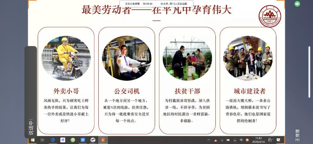 2017级土木一班团支部开展“向最美劳动者致敬”线上主题团日活动,活动由团支书王憬慧和组宣委员吕玥组织,支部全体同学参加。