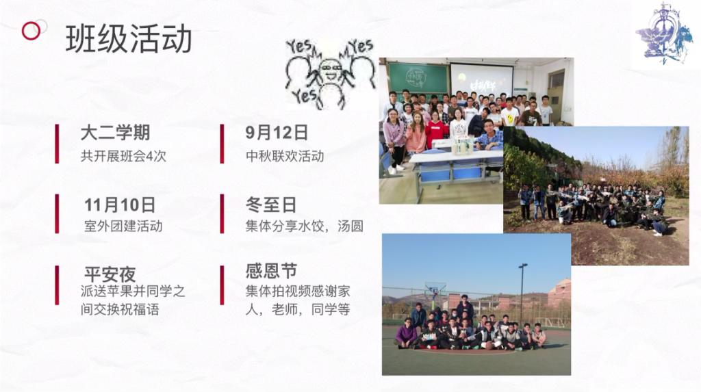 上午10点,班会正式开始。会议伊始,金霄强调了同学们的态度问题,他建议同学们面对各种活动要态度端正,也希望大家以认真的态度继续接下来的两年大学生活。副班长歐永楷展示班级过去两年的成果以及不足,介绍班级同学的学生工作参与度、班级活动的开展情况、班级集体和个人获得的荣誉、班级志愿服务的开展状况等方面的成果。他强调了宿舍卫生问题,希望大家做好宿舍清理,争取使班级拥有更多的优秀宿舍。同时,他详细分析了班级同学在专业的排名情况,并鼓励大家在之后的学习中继续努力,为目标不懈奋斗。