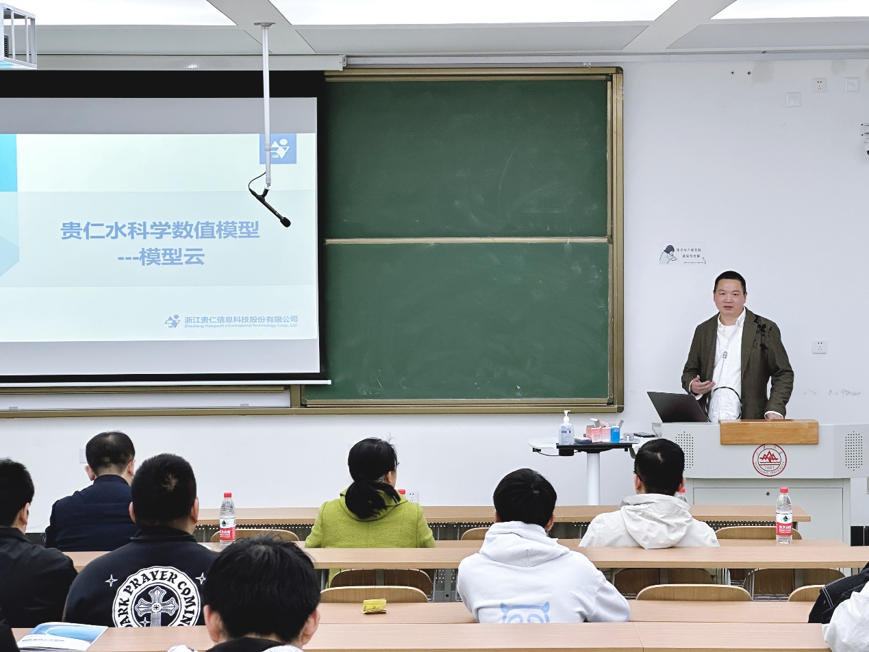活动伊始,毛德强院长首先向同学们介绍了水利行业的发展方向,强调了数值模型、模型云、大数据等技术在“水利4.0”中的关键作用,提出了在当前的国际形势下掌握水利数值模拟核心科技的重要意义,并向贵仁科技的技术人员提出了同学们对模型云的兴趣点和困惑之处。随后,贵仁科技的梁茂源技术总监从行业背景、数值模型、模型云概念及特点、应用场景这四个方面进行了具体讲解,重点介绍了数值模拟在水动力、水文及水质方面的广泛应用和独特优势,详细讲解了数值模拟通过构建数学模型引擎、结合现场资料搭建实例化模型场景、调整模型参数、正式方案试验的基本步骤,结合水利行业需要介绍了数值模拟在洪水演进、水工调度、城市管网设计及内涝、海绵城市评估、面源污染评估与预测方面的应用及基本工作原理。结合模型云的特点,梁总向同学们讲解了贵仁科技模型云平台产品异构模型兼容、多任务并行、GPU加速计算、资源调度、云计算、数据兼容、海量数据处理、可视化、成本控制等优势,并结合模型案例介绍了模型云的场景应用。最后,贵仁科技的技术人员向同学们展示了浙江某流域洪水综合预报调度系统,并通过实操展示了两百年一遇暴雨造成的淹没区域、受灾人口、淹没房屋、淹没道路长度、风险区域等关键因素的云计算和运行结果,并展示了流域三维仿真虚拟场景。同学们听讲十分认真,对新概念、新技术表现出高昂的学习热情。